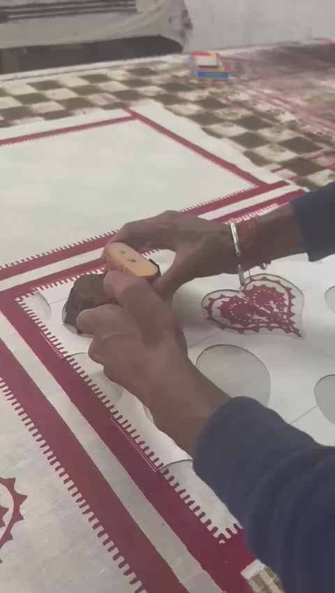 Set of two cream linen placemats with block print heart motifs inspired by Indian folklore and storytelling. Made from sustainably grown linen.