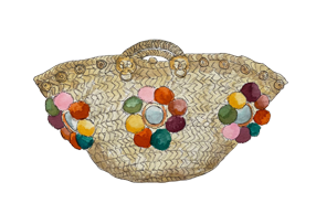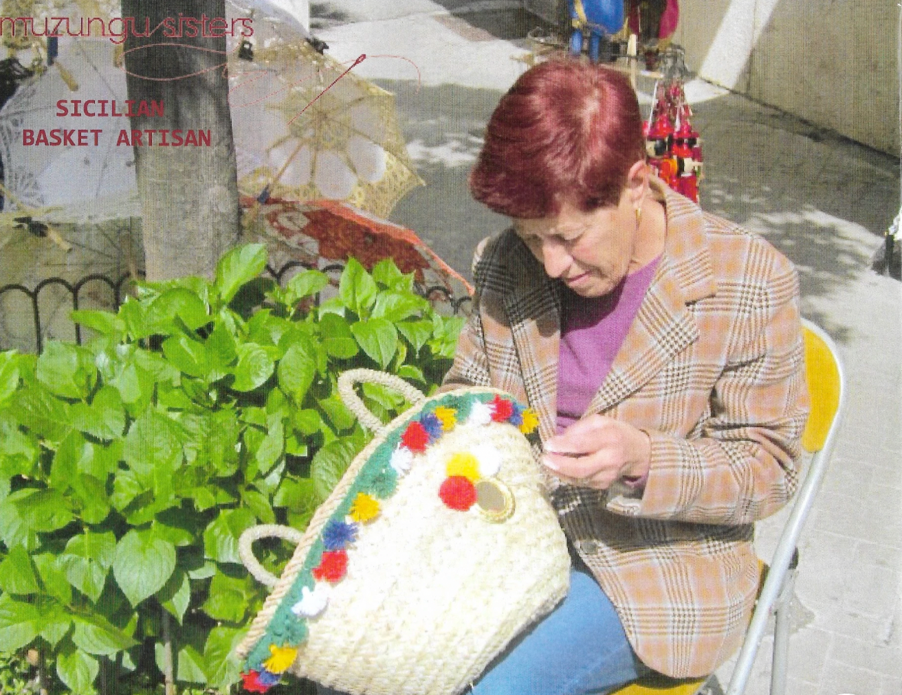 The Sicilian basket, or coffa, is the ancient straw basket used by peasants to feed their horses and donkeys. The original coffa Siciliana is made of palma nana, Sicilian dwarf palm straw, which is an indigenous straw found only in the mountains of Sicily. Muzungu Sisters' Sicilian baskets are still made in the same ancient tradition today; an elderly gentleman (a basket weaver near Palermo) heads to the mountains to collect the palma nana straw and then weaves the baskets by hand for us. The baskets then travel to the east coast of Sicily where they are adorned with pompoms and mirrors in the ancient Sicilian tradition. The adornments are sewed on, stitch by stitch – never glued on as you will find with other baskets.