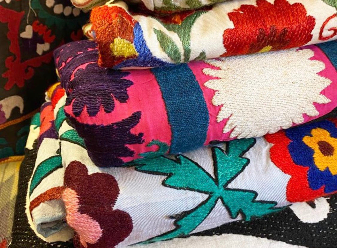 We source all of our Uzbek and Central Asian textiles from a wonderful Uzbek antique textile dealer in Istanbul, Turkey. We can never get enough of his kaleidoscopic silk and cotton Ikats and Suzanis.